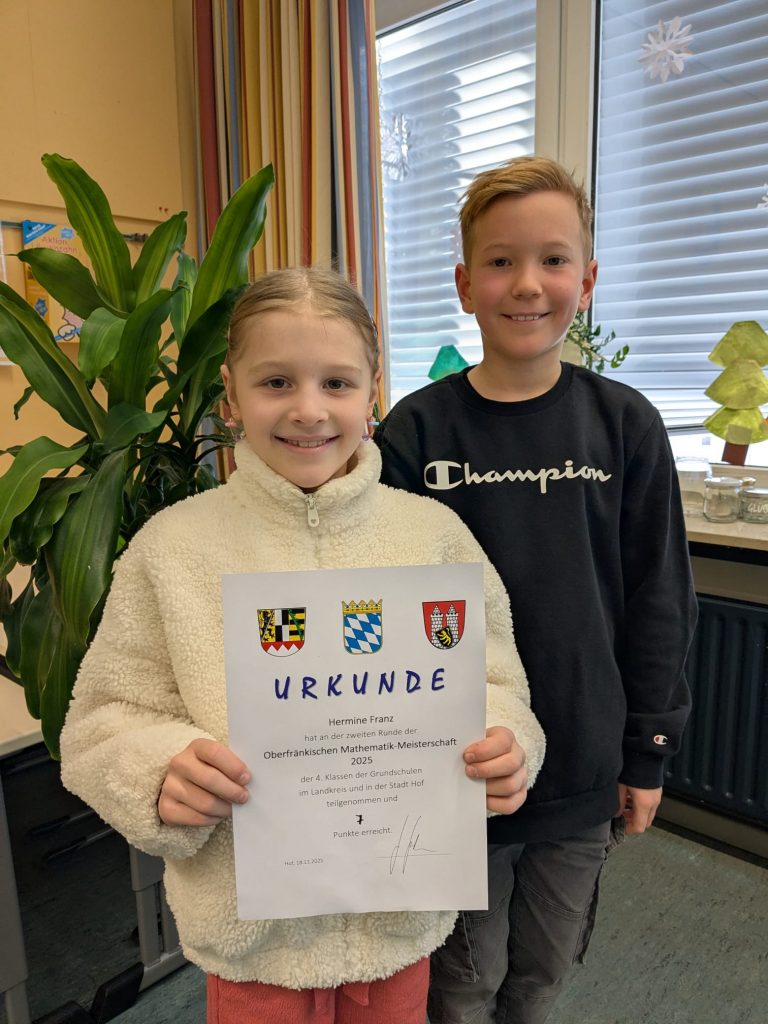 Bei der zweiten Runde der oberfränkischen Mathematikmeisterschaft am 18.11.25 in Hof vertraten unsere Schule Marlon Masuth (4a) und Hermine Franz (4b) mit einem respektablen Ergebnis. Sie waren die Gewinner der ersten Runde an der Schule. Leider konnten sich die beiden nicht für die Endrunde in Thurnau qualifizieren. Wir gratulieren ihnen dennoch herzlich!